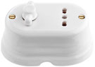 Placca Delux in porcellana bianca con deviatore rotativo e presa bipasso 10/16A da fissare direttamente a muro su scatola 3 moduli da incasso.